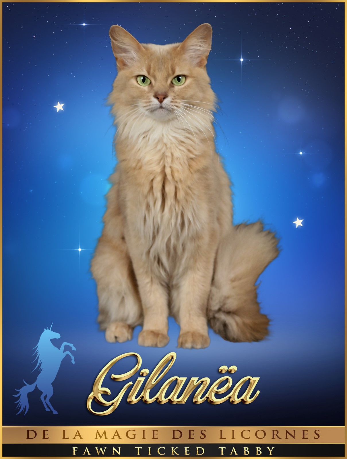 Gilanëa est la fille de Delhys et Feänor. Elle représente tout pour moi , ma fusion. "Mon chat.. ". Elle est le chat qu'on a une relation extraordinaire une fois dans sa vie , même si tout nos autres animaux sont extrêment aimés et choyés. Elle est née à la maison , la 1ère de la chatterie "La Magie des Licornes" à rester parmi nous.