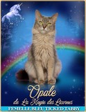 Opale est charmeuse et joueuse, une chatte très attachante et hyper câline. Elle est la fille de notre Gilanëa et Kharn Ka ShireKhan. Son prénom est le nom d'une pierre précieuse (elle l'est à nos yeux).