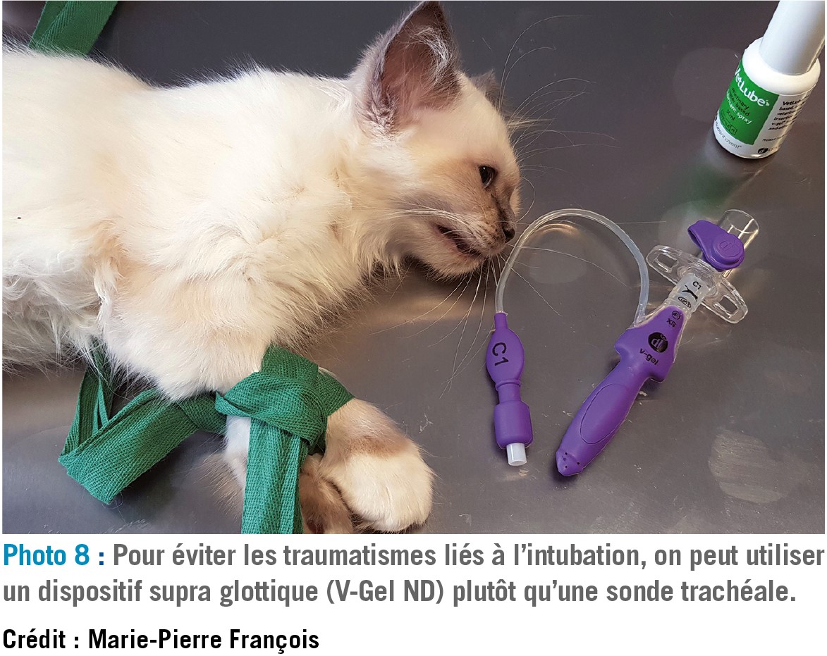 Pour éviter les traumatismes liés à l'intubation, on peut utiliser un dispositif supra glottique (V-Gel ND) (cf. photo 8) plutôt qu'une sonde trachéale. La taille C1 convient aux chatons de moins de 2kg en général.