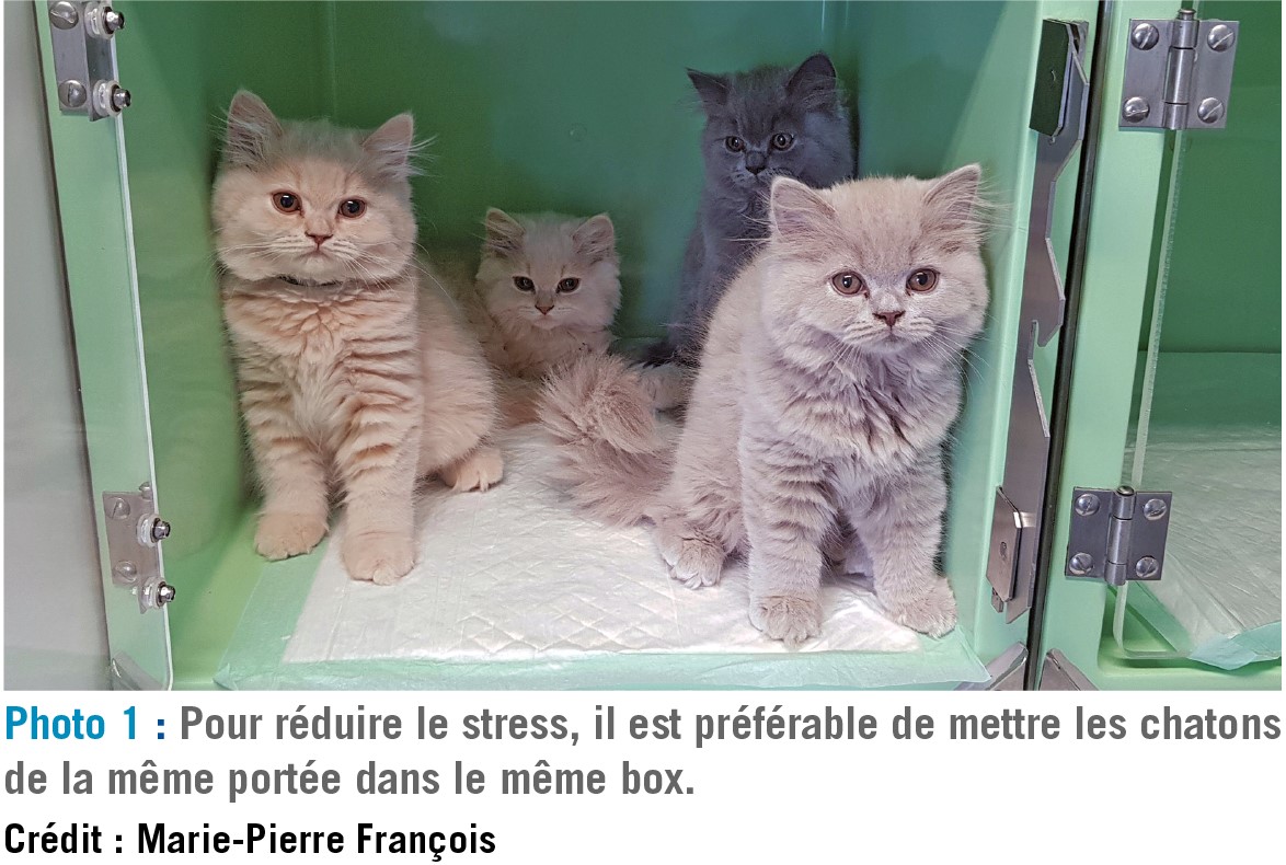 Le jeûne préopératoire doit être court (maximum 4 heures). Il est indispensable que le chaton soit dans un environnement à température contrôlée. Il faut donc éviter toutes les surfaces froides et privilégier le tapis chauffant et la couverture. Dans le cas des portées, il est préférable de mettre les chatons ensemble dans le même box, ce qui réduit aussi le stress (cf. photo 1).